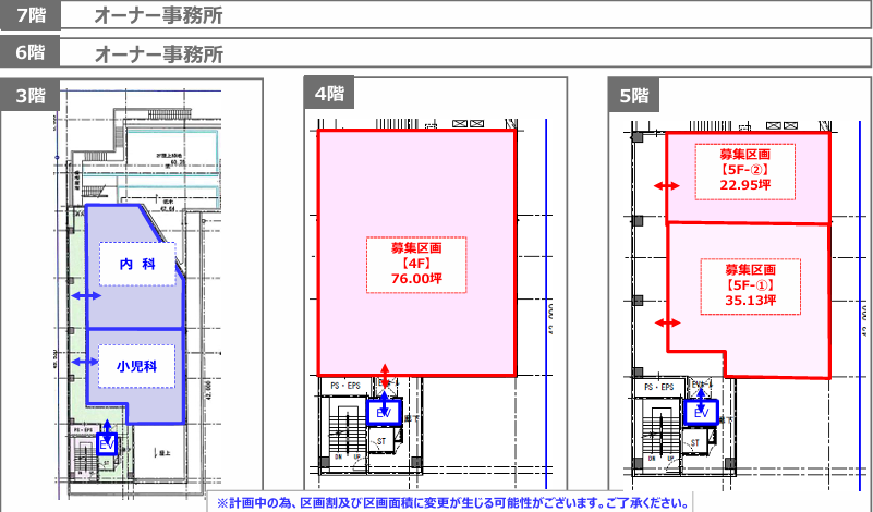 | 面積 | 5階 ①116.13㎡(35.13坪) 5階 ② 75.86㎡(22.95坪) 4階 251.23㎡(76.00坪) |