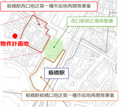 現在、板橋駅の西側では2つの再開発があり、特に物件の目の前は「板橋駅